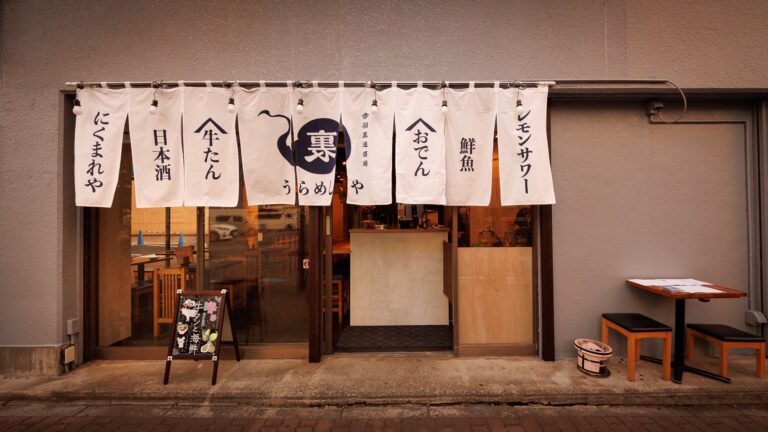 赤羽駅から徒歩数分、白い暖簾と火の玉のイラストが目を引く外観。日差しが差し込むガラス戸の先には、木の温もりと洗練が融合した空間が広がります。